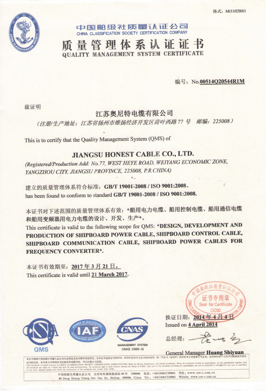 質(zhì)量管理體系認證證書